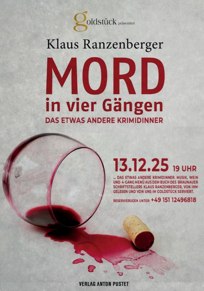 Am Samstag, den 13. Dezember um 19.00 Uhr gibt´s was ganz Besonderes! Ein Krimidinner, allerdings auf eigene Art. Zu einer Lesung aus meinem Burgheim-Krimi "Mord in vier Gängen" wird euch das Team vom "Goldstück" ein 4Gang Menü nebst Getränken servieren, und zwar exakt wie im Buch beschrieben! Wir freuen uns schon sehr auf dieses neue Format, vielleicht sehen wir uns.