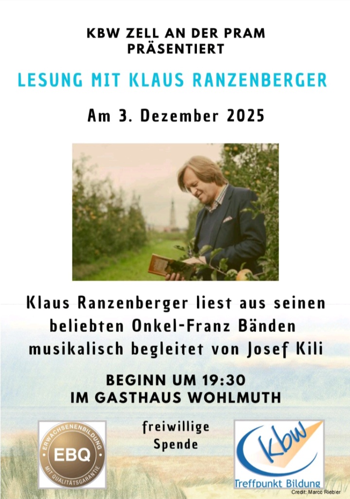Am Mittwoch, den 3. Dezember dürfen Josef Kili und ich - der Onkel Franz ist selbstverständlich auch dabei - in Zell an der Pram auftreten. Los geht´s um 19.30 Uhr im Gasthaus Wolmuth, wir bitten um zahlreiches Erscheinen!